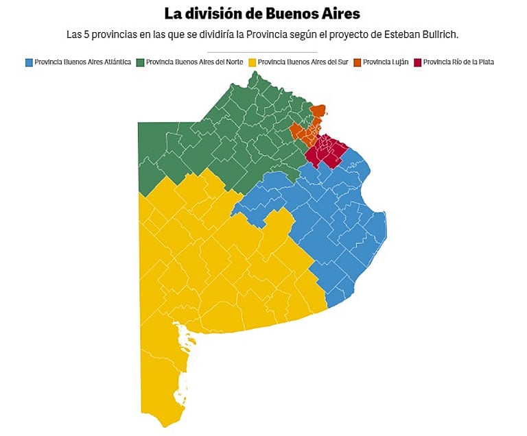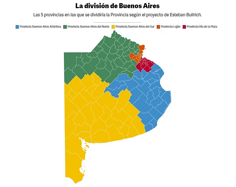 La propuesta de las nuevas cinco provincias establece una provincia de Buenos Aires del Norte, con capital en San Nicolás; otra provincia de Buenos Aires del Sur, con capital en Bahía Blanca; otra provincia de Buenos Aires Atlántica, con la capital en Mar del Plata. Mientras que las dos nuevas provincias que contienen al conurbano son provincia de Luján, con capital en la ciudad de Luján; y provincia del Río de la Plata, que se quedaría con la actual capital provincial de La Plata.