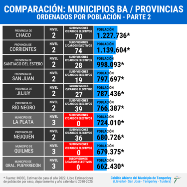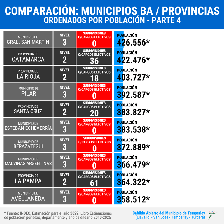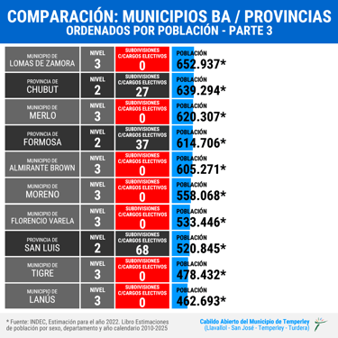 En población, el Municipio de Avellaneda es similar a la Provincia de La Pampa; Berazategui y Esteban Echeverría, cada uno equivale a Santa Cruz; Pilar equivale a La Rioja; Gral. San Martín a Catamarca; Lanús y Tigre, cada uno representa San Luis; Almirante Brown, Moreno y Florencio Varela, son cada uno similares a Formosa, y Merlo es similar a Chubut.
