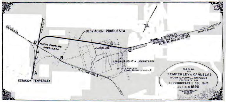Desviación propuesta y realizada para el ramal Temperley-Cañuelas, en el tramo Temperley-Llavallol. Año 1890. Con este cambio, se levantó la vía identificada como A-B-C, se eliminó la primera estación Llavallol (Cementerio de Disidentes o Británico), y el Empalme Santa Catalina.