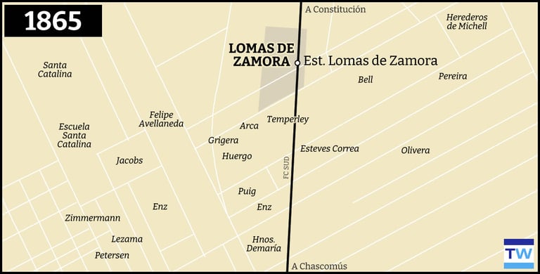 La primera Estación Temperley (1871) estaba ubicada a la altura de la actual calle General Paz y Esmeralda
