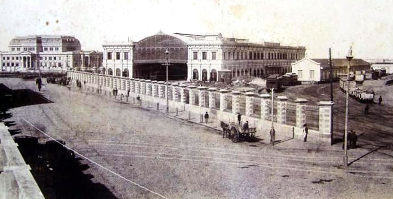 La primera estación Constitución (1865), terminal del Ferrocarril Sud. Los tranvías a caballo transportan a los pasajeros del tren.